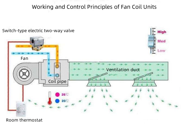 Operation: The thermostat senses the room temperature and compares it to the setpoint. It then automatically controls an electric 2-way or 3-way valve on the water line to regulate flow and may also cycle the fan speeds. This maintains a consistent, comfortable temperature and improves energy efficiency.